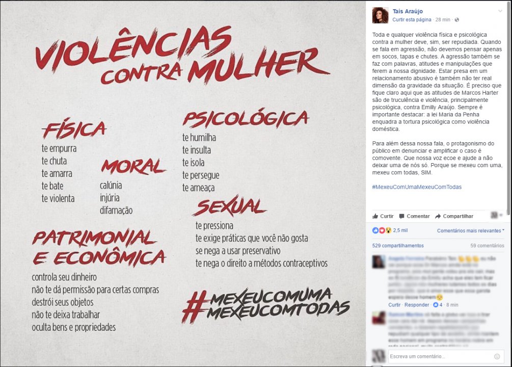 “Toda e qualquer violência física e psicológica contra a mulher deve, sim, ser repudiada. Quando se fala em agressão, não devemos pensar apenas em socos, tapas e chutes. A agressão também se faz com palavras, atitudes e manipulações que ferem a nossa dignidade. Estar presa em um relacionamento abusivo é também não ter real dimensão da gravidade da situação. É preciso que fique claro aqui que as atitudes de Marcos Harter são de truculência e violência, principalmente psicológica, contra Emilly Araújo. Sempre é importante destacar: a lei Maria da Penha enquadra a tortura psicológica como violência doméstica.
