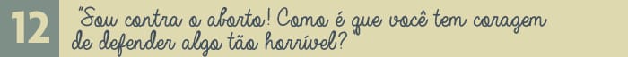 É contra o aborto? Nunca faria um? Ótimo, não faça. O corpo é seu e ninguém deve te forçar a fazer qualquer coisa que você não queira (aliás, o aborto ser descriminalizado não significa que se tornará obrigatório, ok?). O quê? Você é homem e por isso não pode engravidar nem precisaria abortar? Então por que RAIOS você acha que sua opinião sobre um corpo que não é o seu conta? Vai plantar batata e tira a sua opinião do meu útero. ‘Brigadinha.