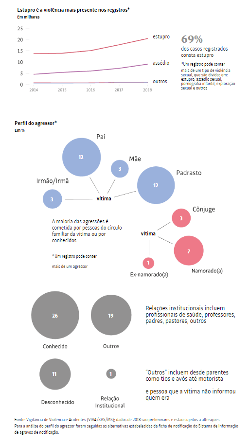 Essas informações compõem o Sistema de Vigilância de Violências e Acidentes (VIVA/SVS/MS), do Ministério da Saúde, e são usadas pelo governo federal para identificar epidemias. A pasta divide a violência sexual em cinco subcategorias: estupro, assédio sexual, pornografia infantil, exploração sexual e outros. O estupro consta na maior parte dos registros.