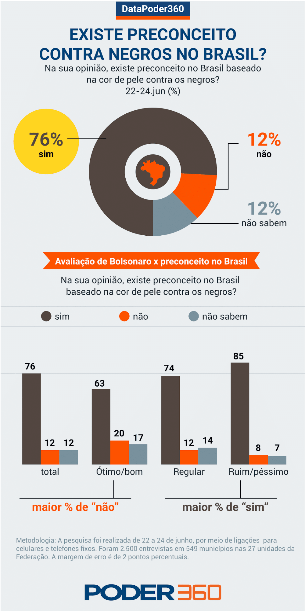 A pesquisa do DataPoder360, divisão de estudos estatísticos do Poder360, foi realizada de 22 a 24 de junho com 2.500 pessoas em 549 municípios, nas 27 unidades da Federação. A margem de erro é de 2 pontos percentuais. Saiba mais sobre a metodologia lendo este texto.