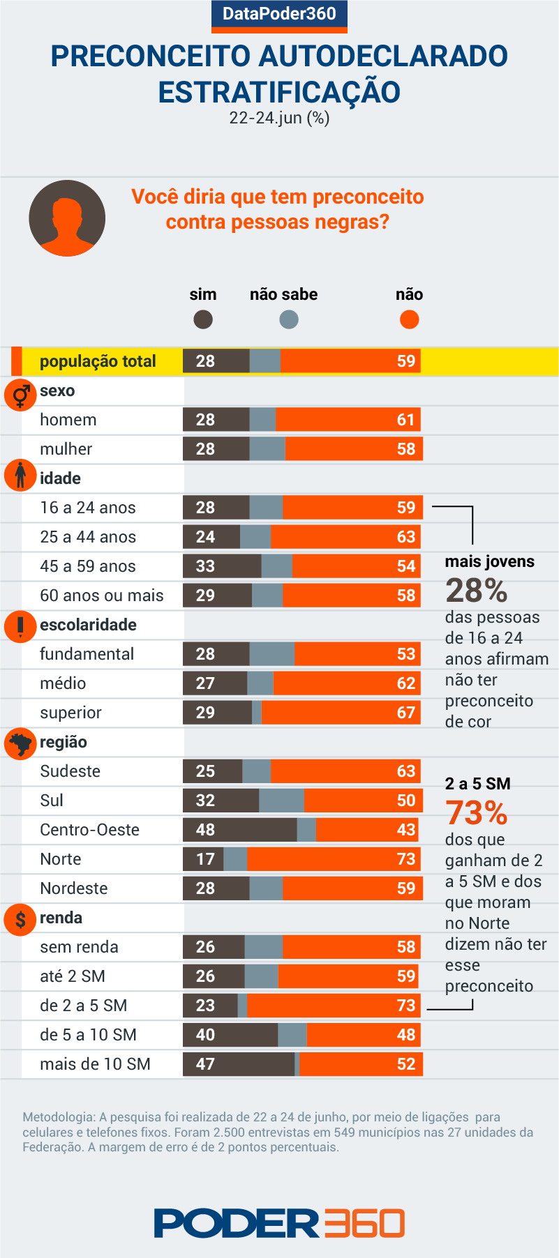 As perguntas feitas pelo DataPoder360 repetiram exatamente o que o Datafolha indagou aos brasileiros em 1995 sobre preconceito por causa da cor da pele. O levantamento resultou no livro “Racismo Cordial” (eis a introdução – 1 MB).