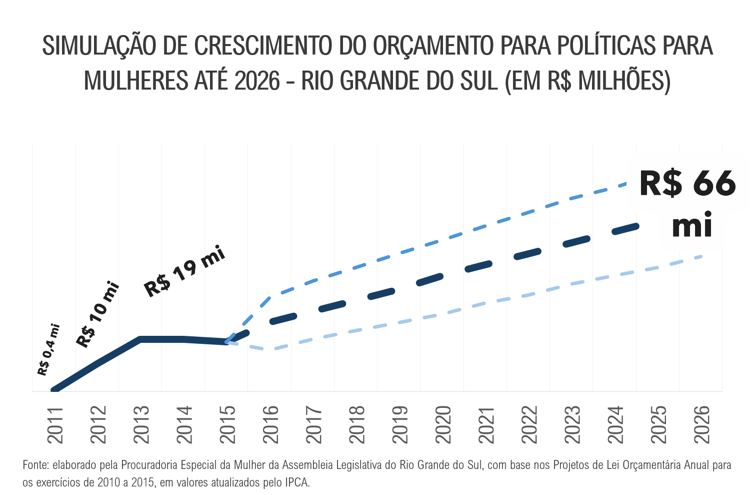 Com base nos mesmos dados orçamentários de 2011 a 2015, período em que o crescimento do orçamento para as políticas para mulheres é verificado, a equipe técnica da Procuradoria Especial da Mulher simulou a manutenção do ritmo desse crescimento. A simulação resulta numa previsão mínima de R$ 49 milhões, uma previsão média de R$ 66 milhões e uma previsão máxima de R$ 84 milhões. De fato, considerando o estado de emergência para a vida e segurança das mulheres gaúchas, bem como a situação de desmonte de equipamentos e políticas para mulheres, o valor anunciado pelo Governador do Estado para 2026 não é adequado.