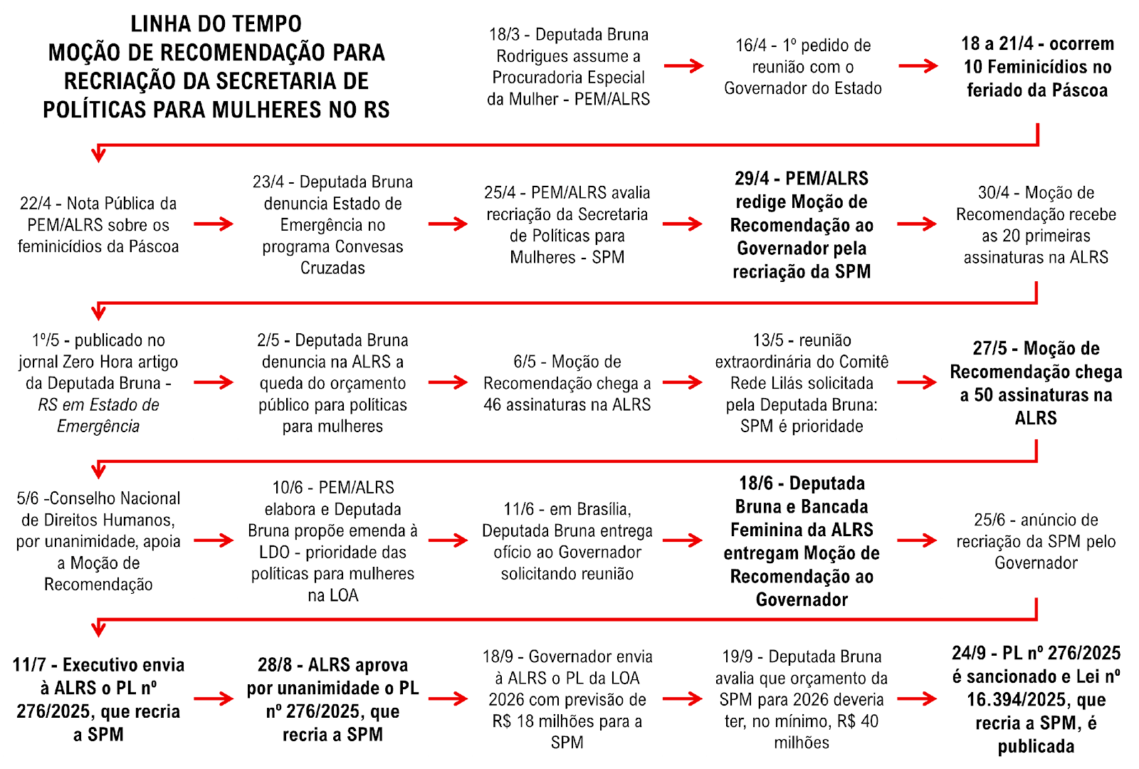 No dia 25 de junho, a Deputada Bruna e as demais integrantes da Bancada Feminina da ALRS retornaram ao Palácio Piratini acreditando que se tratava de uma segunda reunião com o Governador. Lá chegando, são encaminhadas a um dos salões que encontram lotado de outras autoridades e pessoas dos quadros das Secretarias de Estado, na sua grande maioria mulheres. Para esse dia, o Governador realizou um evento para seu anúncio de recriação da Secretaria de Políticas para Mulheres, no qual apresentou o organograma e atribuições da pasta. O Projeto de Lei que propõe a recriação da SPM foi protocolado na Assembleia Legislativa no dia 11 de julho, sob o nº 276/2025, sendo aprovado por unanimidade no dia 28 de agosto. Em 24 de setembro, o PL é sancionado e a Lei nº 16.394/2025 é publicada. Passados 10 anos de sua extinção, período em que os movimentos feministas e de mulheres do RS persistiram na demanda por sua recriação, e após quase cinco meses da proposição da Moção de Recomendação pela Deputada Bruna Rodrigues, a Secretaria de Políticas para Mulheres volta a ser uma realidade no Rio Grande do Sul.
