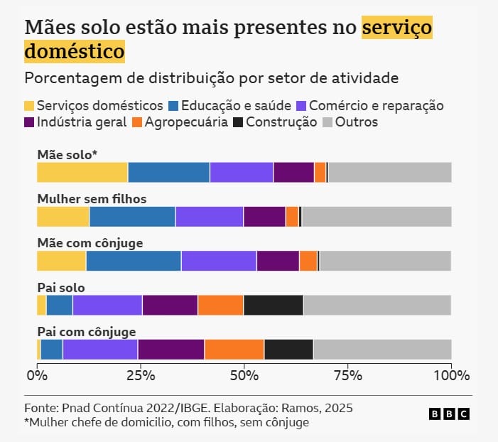 O percentual de mães solo trabalhando como empregadas domésticas é significativamente superior ao das mães com cônjuge (11,8%) e quase 27 vezes maior que o dos pais com cônjuge (0,8%).