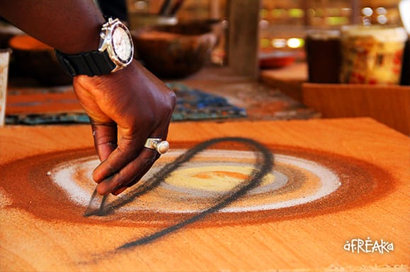 Com uma mistura feita de seiva de baobá e cola arábica, o artista começa desenhando o formato desejado sobre uma tela de madeira. Em um segundo momento, ele escolhe uma cor de areia e vai jogando em pontos selecionados do quadro. Joga por cima uma segunda cor, depois uma terceira e assim por diante. Para quem assiste, o espetáculo é confuso. O quadro fica coberto de areia, sem nenhuma imagem definida. É aí que entra o momento mágico. Depois de todas as camadas de areias apostadas, ele coloca o quadro na horizontal, dando um peteleco no trabalho. Bum. A areia extra cai e uma mulher africana colorida e bem delineada surge na tela. Técnica, criatividade e dom caminhando juntos.