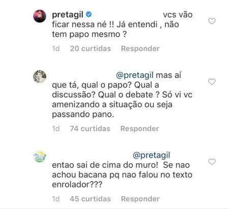 Para os seguidores de Preta, o posicionamento da atriz foi brando e seletivo. Diversos internautas afirmaram que se o caso não tivesse acontecido com uma amiga, ela não teria “passado o pano”.