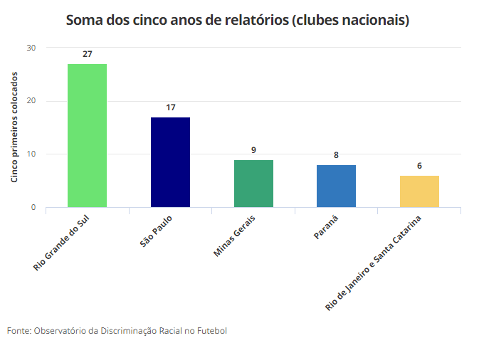 Quando o recorte da análise são os clubes brasileiros, onze estados aparecem com incidência de casos racistas. Em 2018, São Paulo lidera a estatística, com quatro ocorrências, seguido de Rio de Janeiro e Mato Grosso, com dois cada uma. Se considerarmos o acumulado nos cinco relatórios apresentados, desde 2014, o Rio Grande do Sul aparece com 27 ocorrências. São Paulo, com 17, e Minas Gerais, com nove, completam o ranking dos três primeiros.