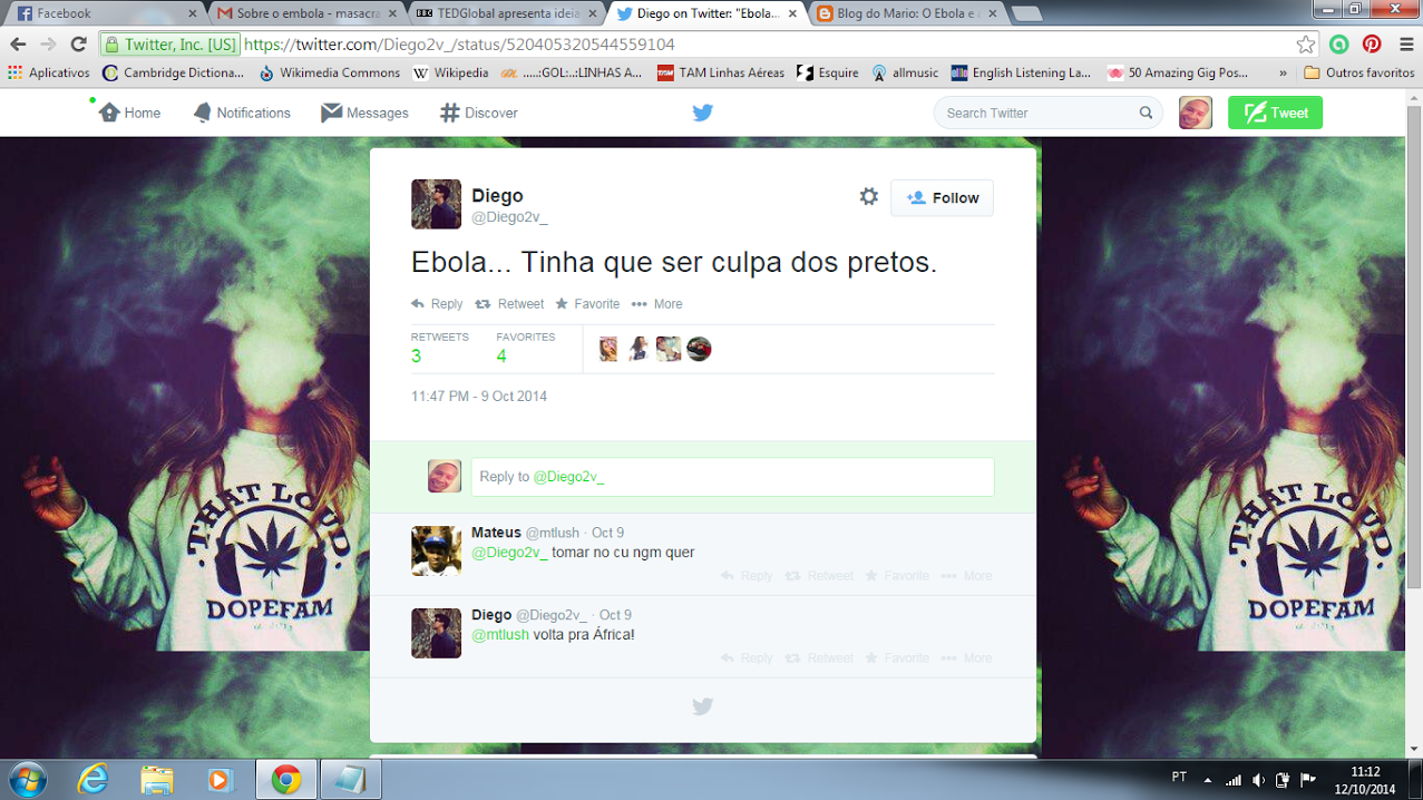 “Não que eu seja racista, mas eu acho que esse NEGRO que tá com ebola, la no Rio de Janeiro deveria ser sacrificado. Vale ressaltar quanto uma atitude é para o benefício da maioria, não é considerado uma atitude anti-ética”.