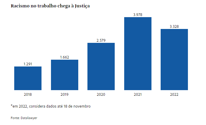 Os dados da ferramenta de jurimetria mostram como a inclusão desses termos têm aumentado a cada ano. Em 2018, 1.291 processos tratavam de temas ligados a racismo nas ações trabalhistas. Em 2022, de janeiro a 18 de novembro, são 3.328 casos.