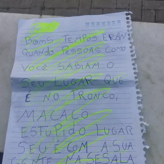 Esse é um dos trechos de um bilhete com ofensas racistas que foi deixado em um prédio no bairro Planalto, na Região Norte de Belo Horizonte. A série de ataques pode ter sido direcionada a um funcionário de uma empresa que presta serviços no condomínio. Ele registrou boletim de ocorrência.