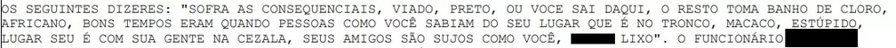 “Sofra as consequências, viado, preto. Ou você sai daqui, o resto toma banho de cloro, africano. Bons tempos eram quando pessoas como você sabiam do seu lugar que é no tronco, macaco, estúpido. Lugar seu é com sua gente na senzala, seus amigos são sujos como você”.
