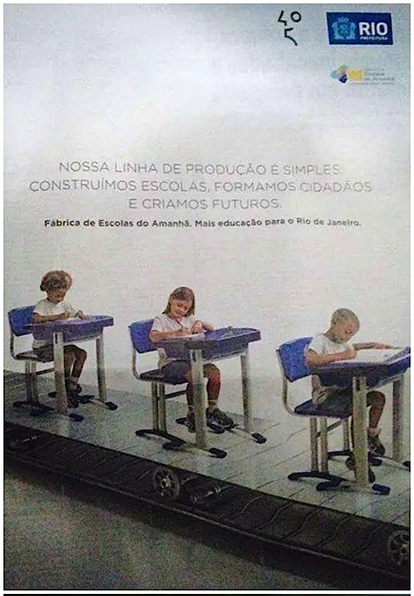 Demorei para comentar o anúncio da prefeitura do Rio de Janeiro, que utilizou uma linha de montagem pata falar da educação, mas achei que valeria uma discussão mais ampla.