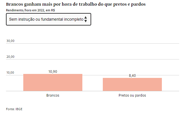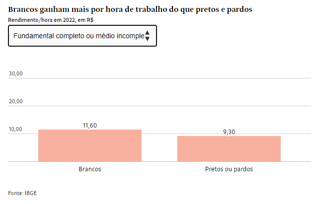 Brancos receberam em média R$ 20 por hora de trabalho no Brasil em 2022, quantia 61,4% maior do que a de pretos ou pardos (R$ 12,4). É o que apontam dados divulgados nesta quarta-feira (6) pelo IBGE (Instituto Brasileiro de Geografia e Estatística).