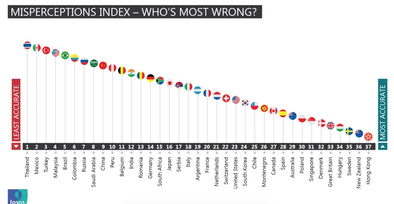 O Brasil ficou em quinto lugar na nova edição do ranking que mede o quanto os países têm noção equivocada sobre a própria realidade.