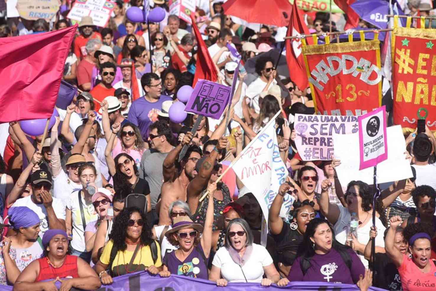 Algumas mulheres e homens carregam bandeiras e ostentam adesivos de partidos políticos. As campanhas de Fernando Haddad (PT), Guilherme Boulos (PSol), Ciro Gomes (PDT) e Marina Silva (Rede) são algumas candidaturas destacadas pelos manifestantes. Segundo os organizadores, a estimativa é de 10 mil pessoas até o momento. A Polícia Militar estima 1 mil.
