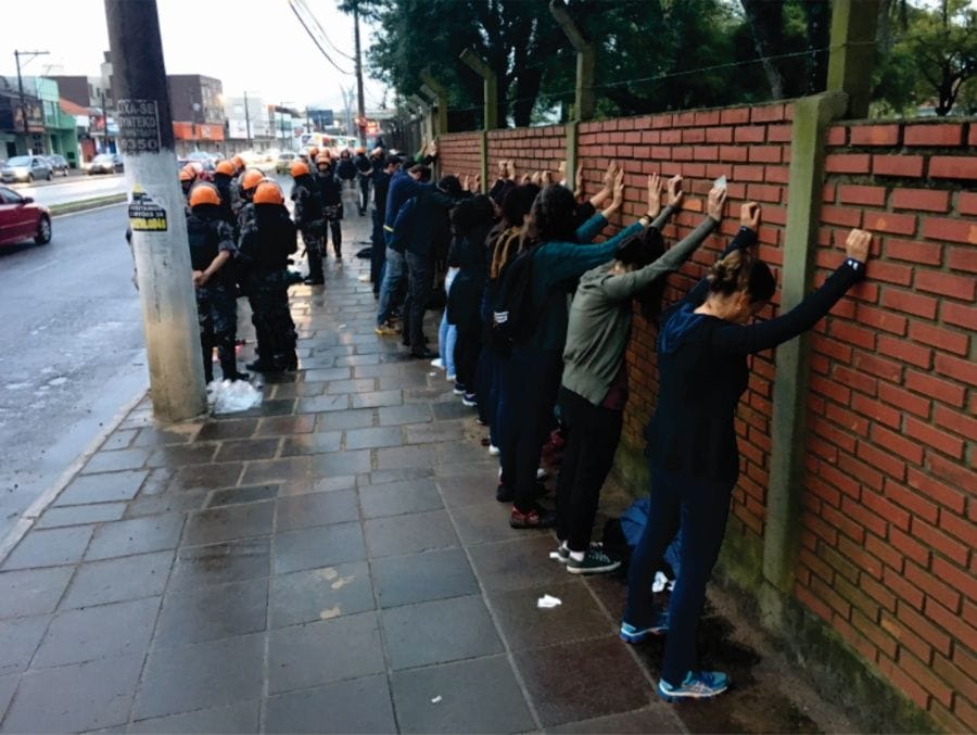 Desarmadas e permanecendo cerca de quarenta minutos com as mãos para cima, sete mulheres abordadas pela Brigada Militar de Porto Alegre, sofreram – sem filtro – a violência da opressão machista, racista e LGBTfóbica, combinada com a repressão brutal da polícia. Elas estavam junto com mais de 120 pessoas que saíram da manifestação em frente à empresa de transporte Carris, no dia 30 de junho, data que marcou a segunda Greve Geral no país. O dia, que deveria ser uma ação de paralisação dos rodoviários e rodoviárias, como forma de exigir dos governos que retirem seus ataques aos direitos da classe trabalhadora, se transformou em verdadeira praça de guerra. A BM atacou violentamente os manifestantes com bombas e muita truculência, prendeu arbitrariamente um professor da rede estadual de ensino e o mandou para o Presídio Central e, um pouco depois, abordou, revistou e despejou quase uma hora de ofensas covardes contra mulheres que estavam na manifestação e até violência física a uma delas.