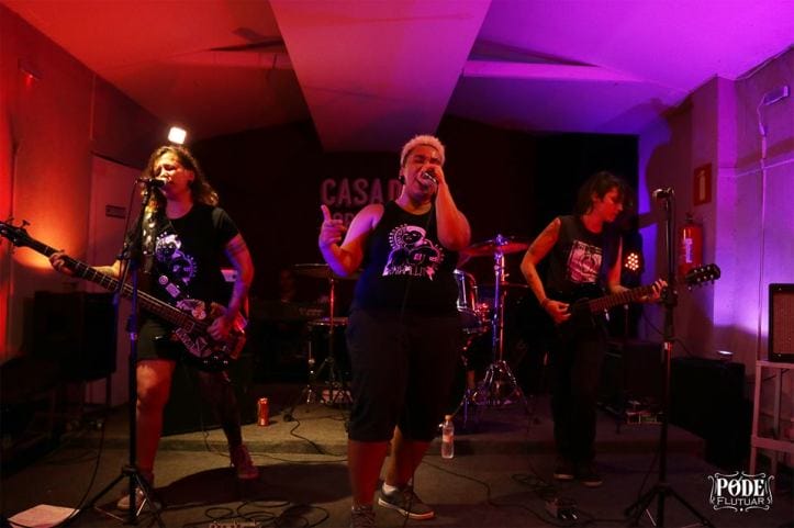 Ana Cléa (guitarra e vocal), Eliane Matos (baixo) e Maria Luiza (bateria)