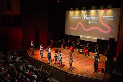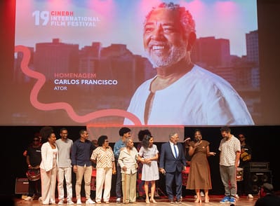 O palco do Cine Theatro Brasil então se abre para a performance do Agbara Groove um quarteto de percussão que tem tanto a força Ilú Obá De Min, das mulheres que tocam tambor, como o axé de Ilu Inã, que traz a alma do fogo para a apresentação incendiária do Favelinha Dance, com a batida do funk que num passado recente era um ritmo interditado em festas de abertura de festivais de cinema de grande prestígio e tradição. Ao coro de talentos se soma a multiartista Josy.Anne com uma releitura contemporânea da congada mineira. Nessa encruzilhada da ocupação com o espetáculo, a apresentação da noite esteve sob a regência de David Maurity que tem carimbado seu nome na cena política e cultural de BH desde a Gaymada, povoando a Praça da Estação com muita viadagem. Em sua companhia esteve Lira Ribas, atriz, cantora, rainha da Corte Devassa e filha de Marku Ribas, patrimônio da música preta mineira. A noite ainda reluziu negritude com o ator Carlos Francisco, o grande homenageado desta edição.