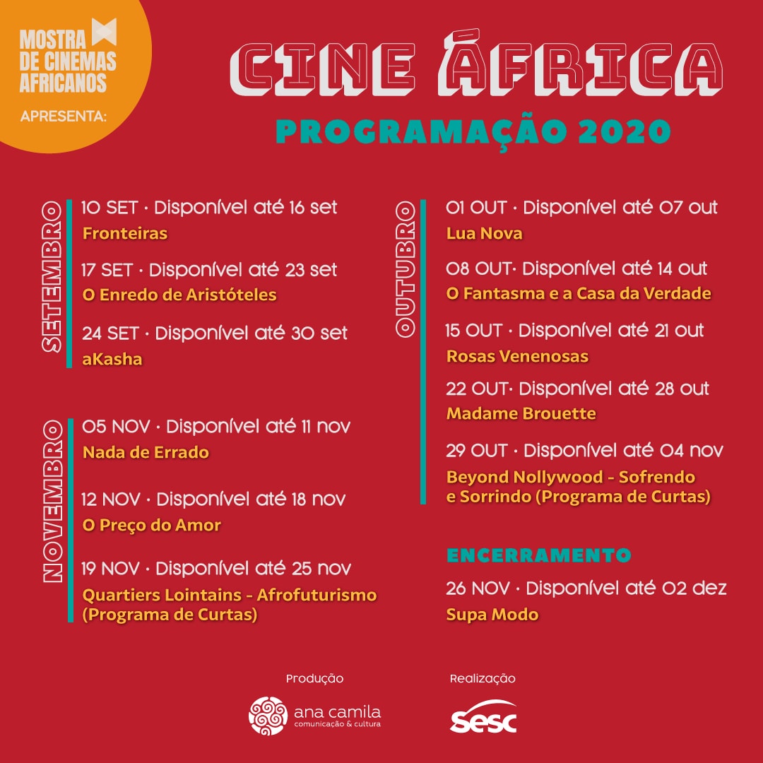 Entre os meses de setembro e novembro, a Mostra de Cinemas Africanos apresenta a nova edição do Cine África, com vários títulos de ficção e documentários, alguns inéditos no Brasil. O projeto online e gratuito traz 12 sessões (dez longas e dois programas de curtas) – todos legendados em português – com filmes de destaque de Burkina Faso, Camarões, Egito, Etiópia, Nigéria, Quênia, Senegal e Sudão, e outras atividades. As exibições serão realizadas no site da plataforma Sesc Digital. O Cine África é uma realização do Sesc São Paulo. Maiores informações no site mostradecinemasafricanos.com.