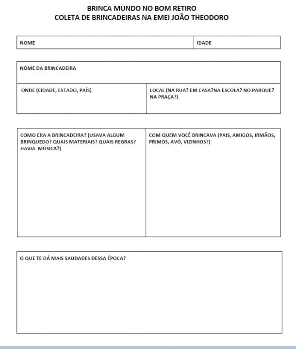 Nem todo mundo guarda em si as danças, histórias, folclores e tradições de seu local de origem. Mas todo mundo brincou inserido nesses contextos. Após escutar a escola, foi hora de saber do que brincavam os pais. Para isso, foi montado, ao longo de três dias, uma barraquinha na frente da EMEI, no horário de entrada e saída das crianças, no qual era distribuído o mesmo formulário usado com os professores e professoras. Também foi feito um processo de escuta oral que posteriormente foi sistematizado.