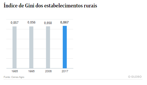 Em outro recorte sobre a desigualdade, o Índice de Gini dos estabelecimentos, que mede a desigualdade do tamanho das propriedades, também é o maior da série história, monitorada desde 1985: 0,867. Quanto mais próximo de 1, mais desigual.