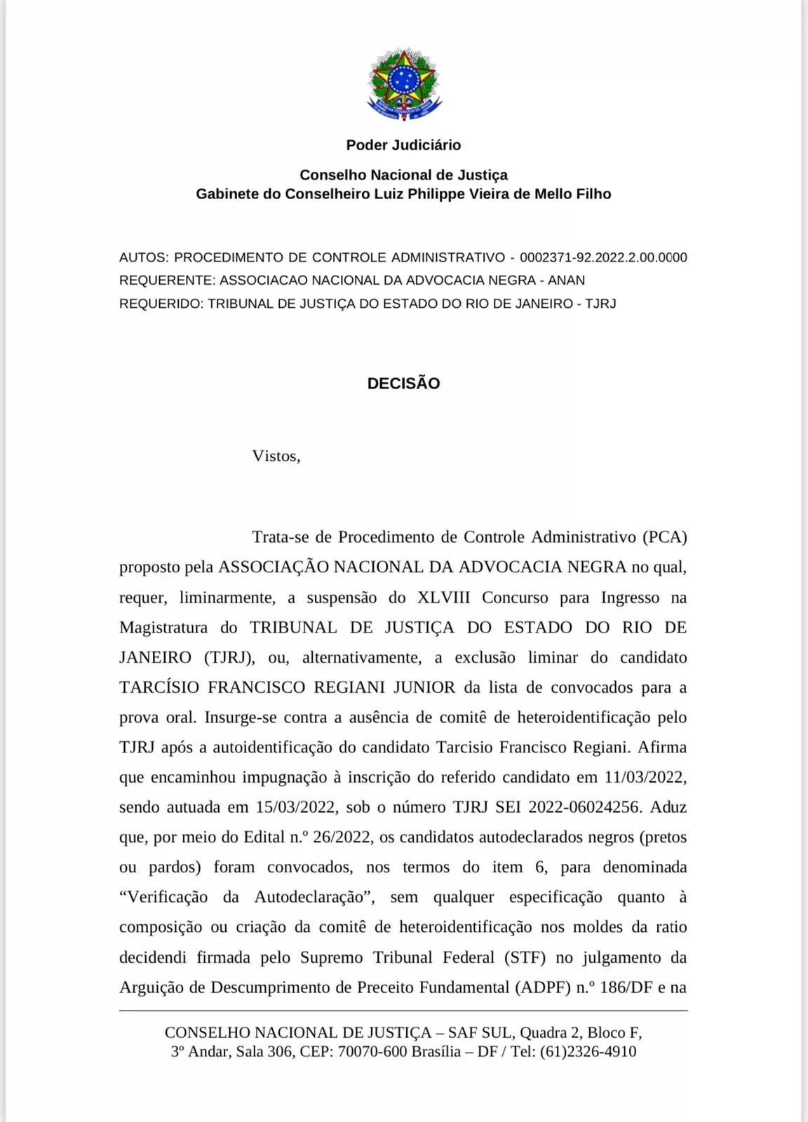 O ministro Luiz Philipe de Mello Filho, do Conselho Nacional de Justiça, suspendeu cautelarmente a posse do advogado Tarcisio Francisco Regiani Junior como juiz substtuto do Tribunal de Justiça do Rio na vaga destinada a pardos e a negros. O pedido foi feito pela Associação Nacional de Advocacia Negra.