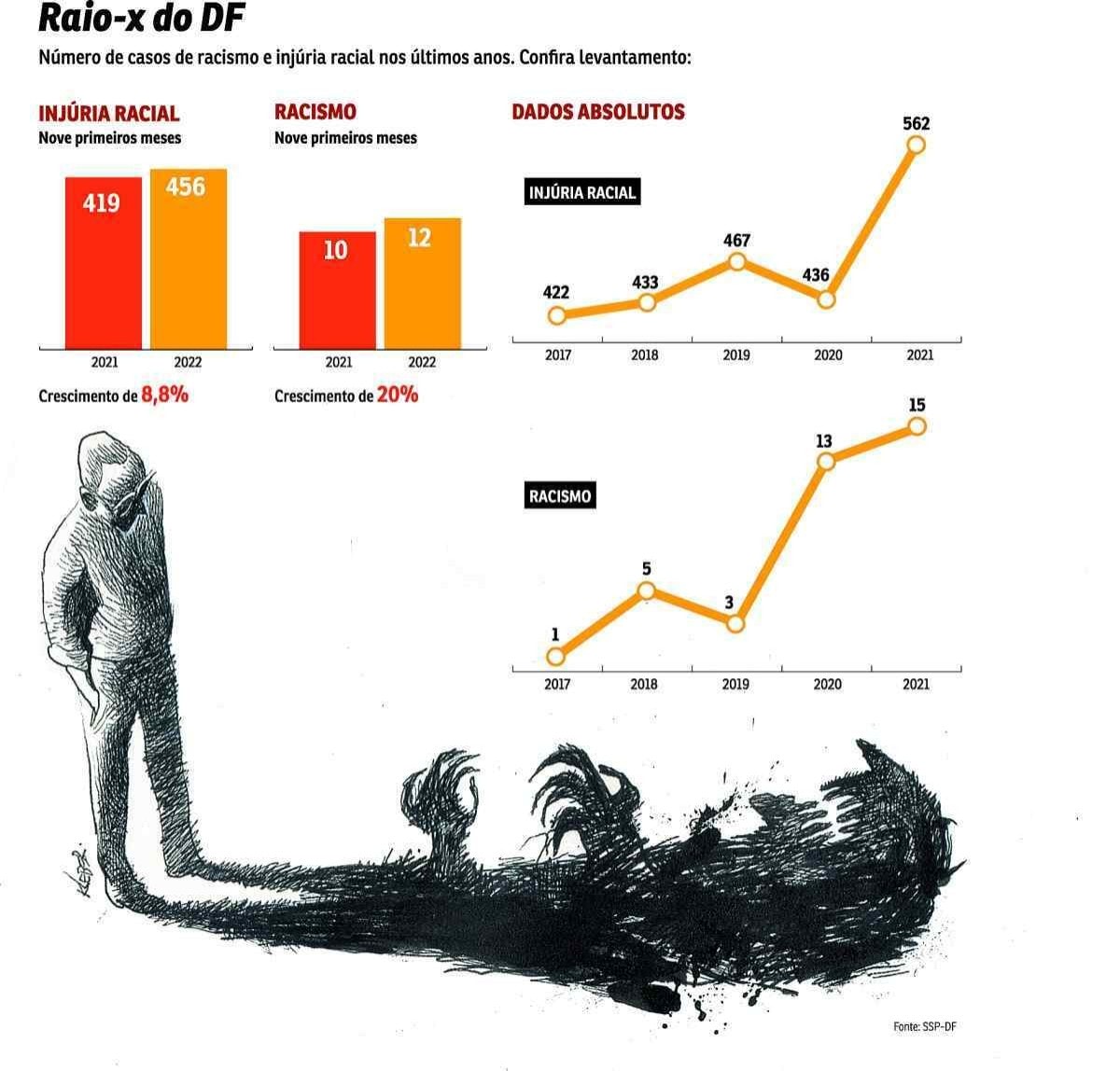 A cada dois dias, ao menos três pessoas são vítimas de injúria racial na capital do país. Ao todo, o último ano contabilizou 562 casos, um aumento de 28% se comparado com 2020, ano da pandemia. Os dados são da Secretaria de Segurança Pública do Distrito Federal (SSP-DF) e apontam, também, para um aumento no registro de ocorrências de racismo. A prática criminosa deixou a marca de três denúncias, em 2019, para 15, no ano passado. Este ano, o alerta é para a tendência de aumento dos casos. Levantamento exclusivo feito pelo Correio aponta que, se comparados os nove primeiros meses deste ano com 2021, os registros de injúria racial no Distrito Federal aumentaram em 8,8% (veja raio-x).
