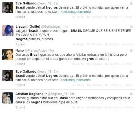 Nas ofensas, os brasileiros foram chamados de “negros malditos”, “macacos” e outros nomes impublicáveis. Imediatamente, os internautas daqui responderam com ironias e piadas sobre o vice campeonato dos “hermanos”.