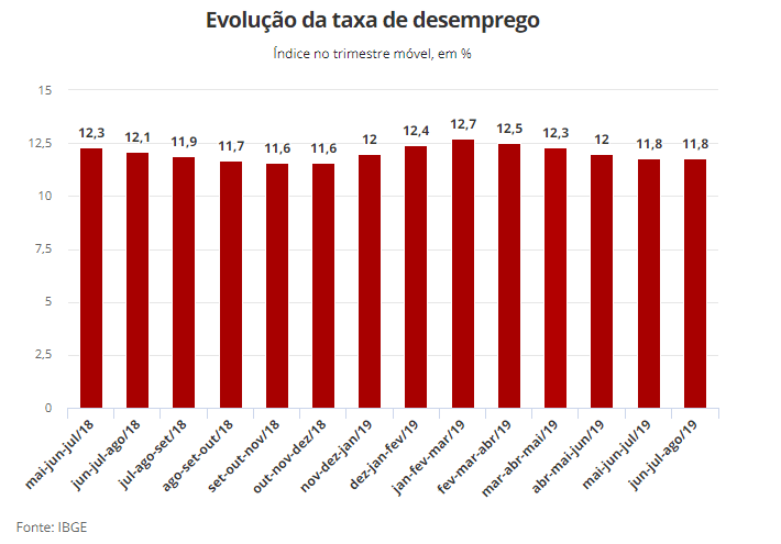 O resultado representa uma estabilidade frente ao trimestre encerrado em julho, quando a taxa também ficou em 11,8% e o número de desempregados também foi calculado em 12,6 milhões.