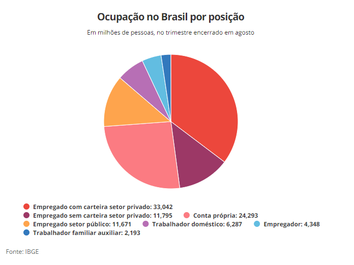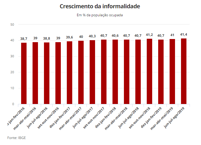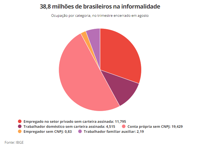 Em agosto, 41,4% da população ocupada (38,8 milhões) se encontrava na informalidade, a maior proporção desde 2016, quando a pesquisa passou a investigar empregadores e trabalhadores por conta própria sem CNPJ, superando assim o recorde anterior, registrado no trimestre encerrado em julho (41,3%).