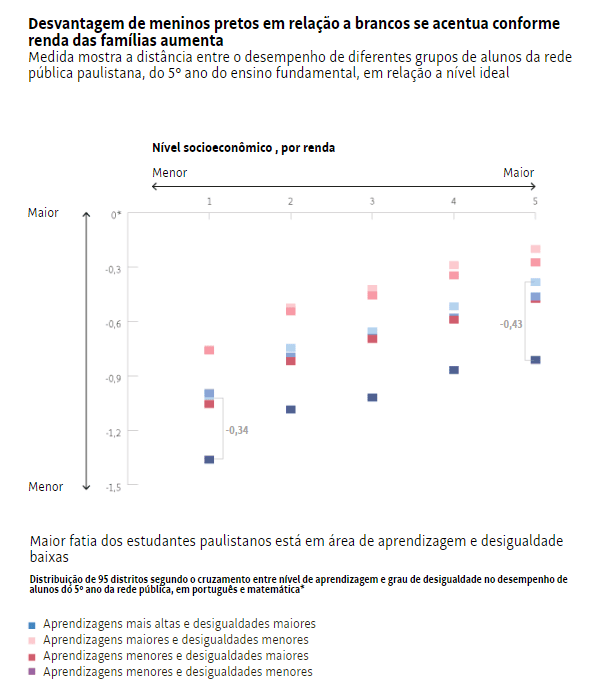 No menor nível socioeconômico analisado, as fatias de meninos pretos e brancos com desempenho abaixo da referência são de, respectivamente, 44,4% e 38% do total. A distância entre eles é, portanto, de 6,4 pontos percentuais.