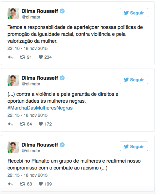 Dilma salientou que a luta das mulheres é contra o racismo, a violência e a desigualdade social e de gênero, pauta que o governo tem assumido. “Reafirmei nosso compromisso com o combate ao racismo, contra a violência e pela garantia de direitos e oportunidades às mulheres negras”, escreveu.