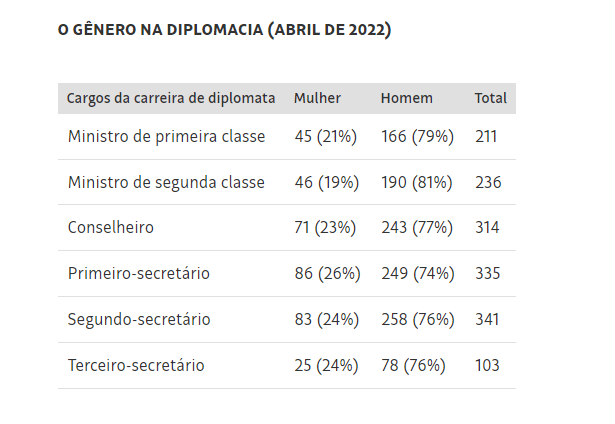 Por falta de dados empíricos, um estudo encomendado pela ADB (Associação dos Diplomatas Brasileiros) no fim de 2021, que deve ficar pronto no final deste ano, pretende mapear a diversidade na carreira diplomática do país em aspectos como gênero, raça e orientação sexual.