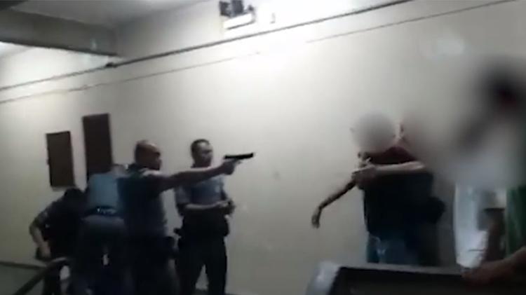 As imagens mostram também que um dos PMs chegou a apontar uma arma em direção a estudantes que observavam e gravavam a cena.