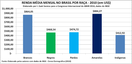 No entanto, o rendimento médio mensal de homens negros em 2010 foi de apenas US$ 327,94, enquanto a média mensal dos homens brancos era naquele ano de US$ 525,15 (IBGE, 2010).