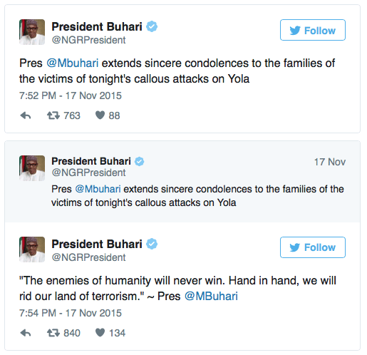 Em mensagem publicada no seu Twitter, o presidente da Nigéria, Muhammadu Buhari, expressou condolências às famílias e disse que “os inimigos da humanidade não vão vencer”.