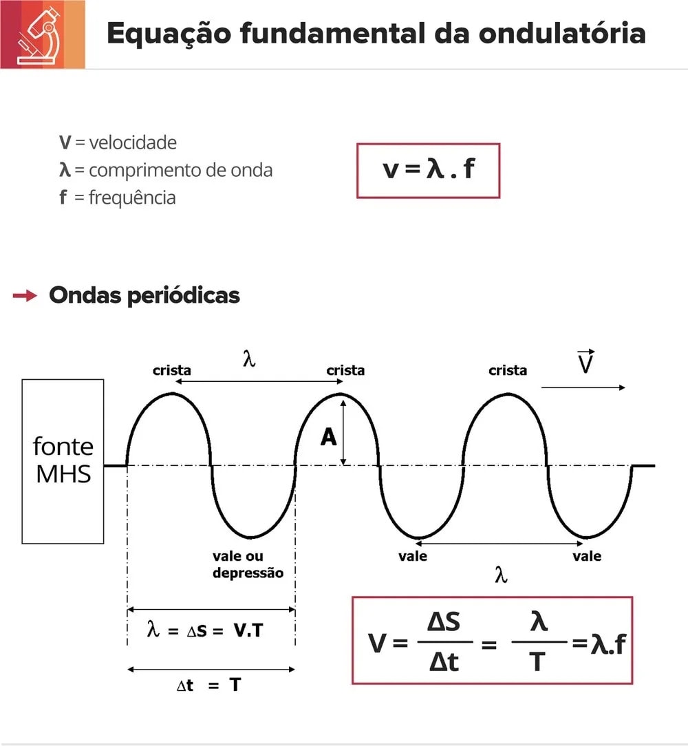Essa fórmula relaciona a frequência, a velocidade e o comprimento de uma onda. Ter o domínio dessa equação já é o bastante para responder a maior parte do conteúdo de ondulatória do Enem.