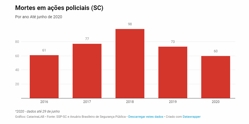 Os dados desta reportagem estão no Anuário Brasileiro de Segurança Pública e nos relatórios da Secretaria de Segurança Pública de SC. A informações referentes às mortes em ações policiais em Florianópolis no ano de 2019 só contabilizam casos até o mês de junho daquele ano. A informação foi requisitada à SSP por meio de assessoria de imprensa e via LAI, mas ainda não foi disponibilizada pelo órgão.