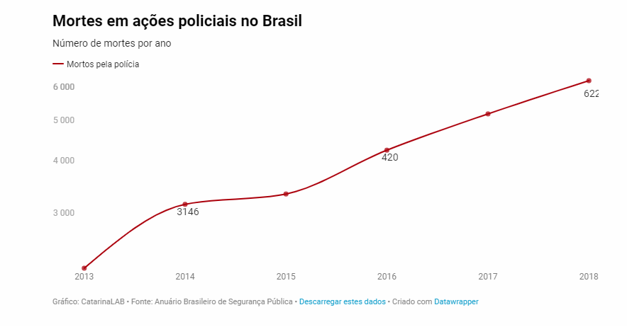 Segundo o último Anuário Brasileiro de Segurança Pública, publicado em 2019 e com dados compilados até 2018, a polícia brasileira matou 6.220 pessoas. São 11 mortes a cada 100 mortes violentas intencionais. Em seis anos, entre 2013 e 2018 (dados do anuário), 24.327 pessoas perderam a vida pelas mãos de policiais, um crescimento de 166,7%. Em caminho oposto, as mortes violentas intencionais subiram apenas 2,7% no período, de 55.847 para 57.358.