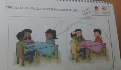 A indignação de Aline tem um histórico. O mesmo livro trouxe, na página 16, um exercício onde há duas mesas, uma com uma família de negros tristes e outra com família de pele mais clara sorrindo. A tarefa foi passada pela escola no dia 17 de março.