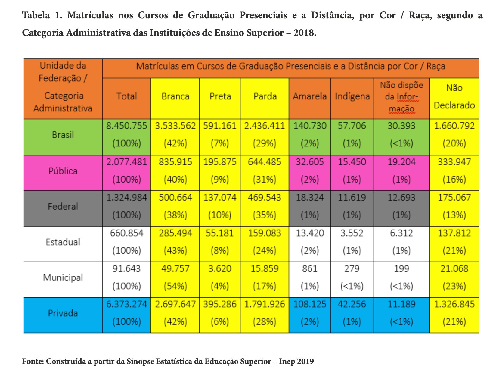 Voltando ao universo retratado pelo Inep por meio da Sinopse Estatística de 2018, encontramos uma única e fundamental caracterização do conjunto de estudantes brasileiras/os a partir de sua cor/raça, conforme a Tabela 1 a seguir, que mostra uma expressiva mudança no perfil étnico-racial do corpo discente dos cursos de graduação. Note-se que especialmente as universidades e institutos federais hoje já contam com um número maior de estudantes autodeclaradas/os negras/os (pretas/os e pardas/os) do que brancas/os, a despeito do alto índice de “não declaração” do quesito cor/raça (20% para o total de IES e 13% no caso específico das instituições federais). Tais percentuais, seguramente, seriam inconcebíveis se imaginados para outras variáveis de identificação pessoal, como idade e sexo, por exemplo.