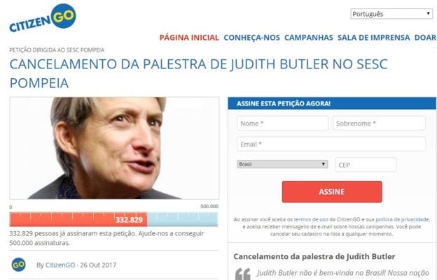 Já o abaixo-assinado que pede o cancelamento da palestra afirma que “Judith Butler não é bem-vinda no Brasil”, porque a filósofa propõe “a desconstrução da identidade humana pela desconstrução da sexualidade”.