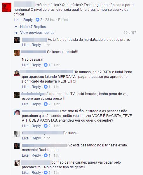 As ofensas à jovem foram feitas nos comentários de um post publicado por Milton Nascimento, que elogiava a apresentação da garota no programa. Um dos usuários diz: “Irmã de música? Que música? Essa neguinha não canta porra nenhuma! O nível do brasileiro, seja qual for a área, tornou-se abaixo da crítica!”.
