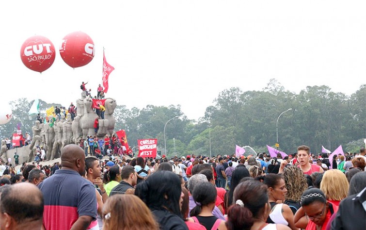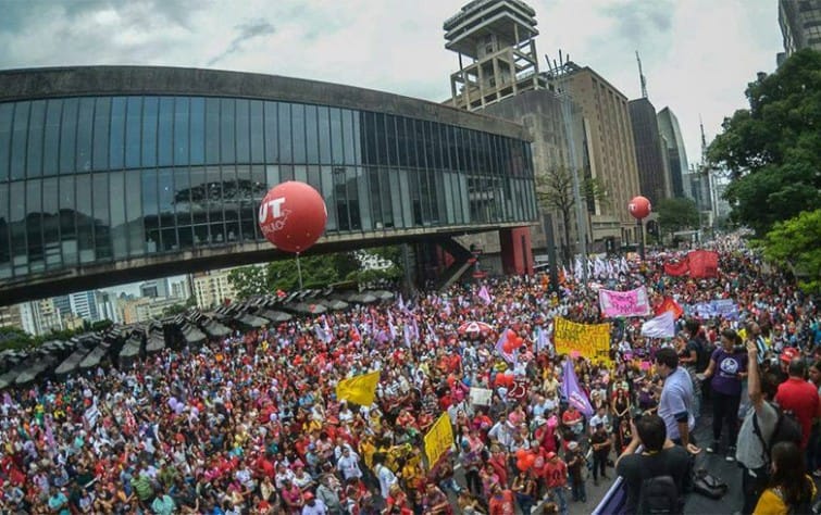 Antes do início de caminhada, as duas faixas da Avenida Paulista, diante do Masp, foram tomadas por manifestantes que, depois, seguiram até o Parque do Ibirapuera, em São Paulo. Fotos: Jornalistas Livres. Organizadores estimaram em 60 mil os presentes ao ato que terminou no Monumento às Bandeiras; jornais falam em 600. Foto: Roberto Parizotti/CUT