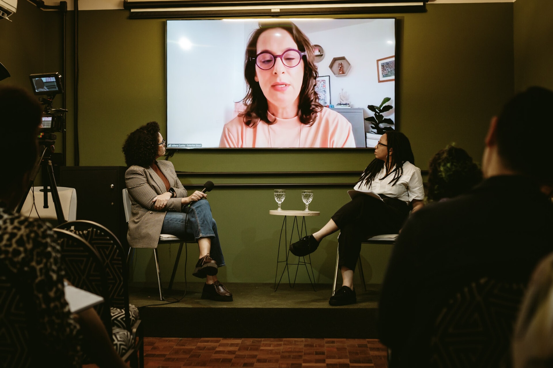 A primeira mesa, “De olho em 2026: IA e Participação Política das Mulheres Negras”, foi mediada por Natália Carneiro, coordenadora de Comunicação Institucional de Geledés, e contou com a participação de Juliana Cunha, psicóloga e diretora na Safernet Brasil; Natália Paiva, sócia-fundadora da Alandar Consultoria; e Fábio Eon, cientista político e Coordenador de Ciências Humanas e Sociais e Ciências Naturais da UNESCO.