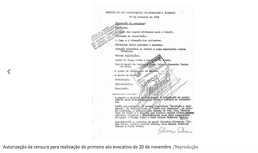 A época, porém, era de ditadura militar. O AI-5 havia endurecido ainda mais o regime, três anos antes. Quando uma nota foi publicada no jornal, com o título “Zumbi – A homenagem dos negros do teatro”, para anunciar o ato evocativo programado para o dia 20, o nome do grupo, talvez confundido com a organização armada VAR-Palmares, chamou a atenção.