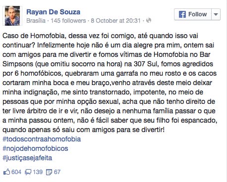 “O que me deixa mais revoltado é que a gente foi agredido pelo simples fato de nossa orientação sexual. Isso ficou bem claro”, desabafou Thayrone à TV Brasília.