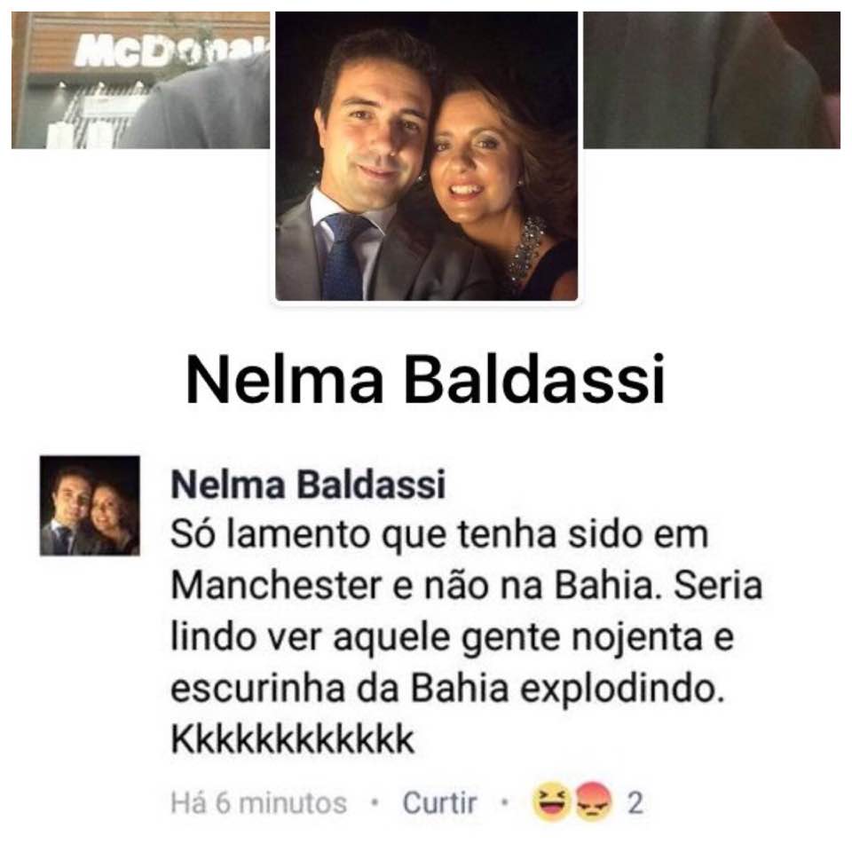 “Só lamento que tenha sido em Manchester e não na Bahia. Seria lindo ver aquele gente nojenta e escurinha da Bahia explodindo. Kkkkkkkkkkkk”, escreveu a mulher. Revoltados, os internautas passaram a compartilharam prints do comentário e da página do Facebook.