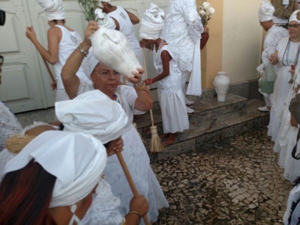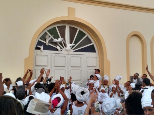 Vestidas com saias e colares, mulheres seguravam vasos com flores e água de cheiro, além de faixas em protesto contra a intolerância religiosa em Alagoas. Já na Praça do Bonfim, que fica em frente à igreja, houve a revoada de pombos, seguida da queima de fogos e a lavagem da escadaria do templo.