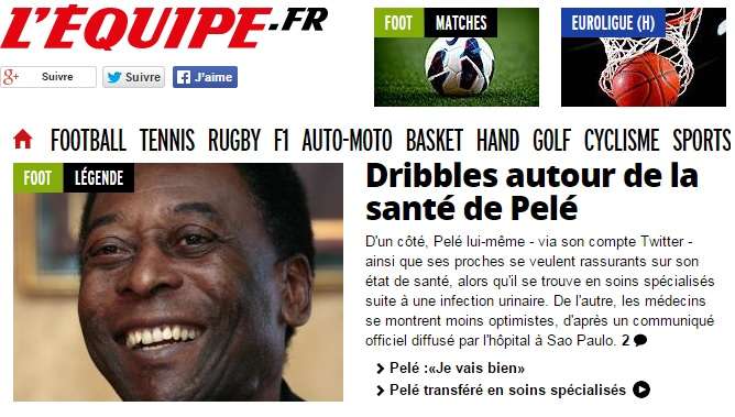 Na Espanha, por exemplo, os maiores jornais de Madri, Marca e As, relataram as últimas notícias sobre o maior jogador da história e não pouparam adjetivos a Pelé. “Rei do Futebol” e “Maior estrela do futebol brasileiro” foram alguns deles. Na França, o L’Equipe preferiu chamar o ex-atleta de “Lenda” e destacou a “ansiedade” de todo o planeta para que ele melhore logo.